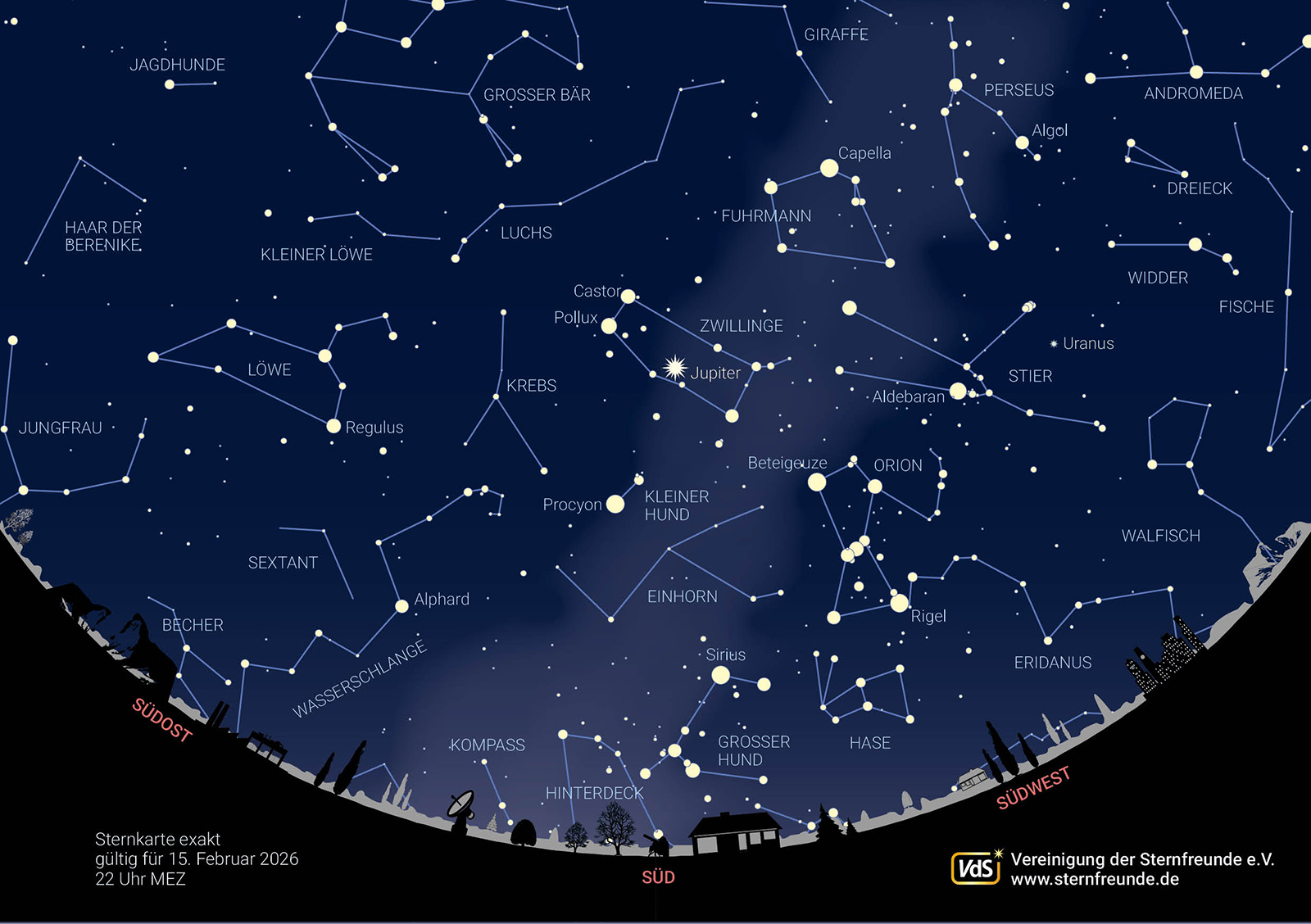 Sternkarte für Februar 2026. Grafik: Vereinigung der Sternfreunde (VdS) zum Download