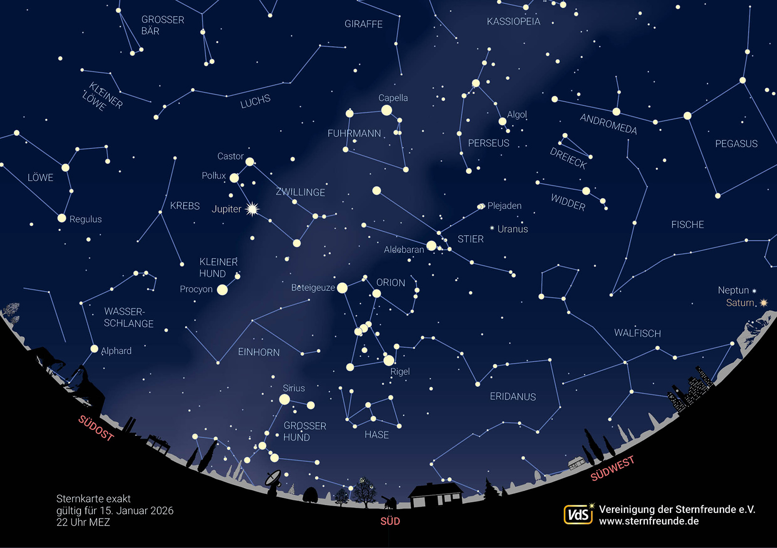 Foto 2: Sternkarte für Januar 2026. Grafik: Vereinigung der Sternfreunde (VdS)